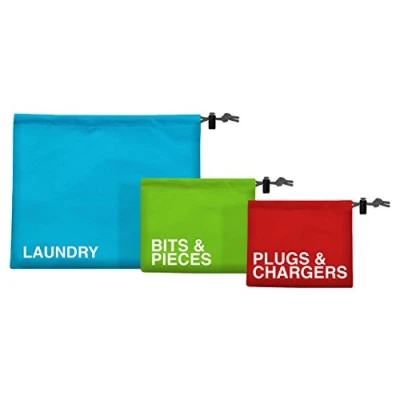 Set of three drawstring bags perfect for organising your holiday essentials Large laundry bag (47cmx38cm), bits and pieces (29cmx23cm), plugs and chargers (25cm x 21cm). All in wipe clean durable nylon with printed labelling as shown. Please refer to packaging before use. Safe & Sound is a long established brand designed and manufactured for Murrays Health & Beauty.