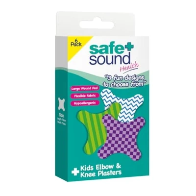 Safe & Sound Kids Elbow Knee Plasters 6 Pack Large Hypoallergenic Fabric with Fun Designs for Children Flexible Wound Care Scrapes and Grazes