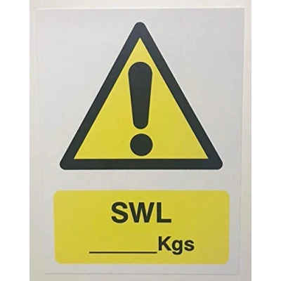 Safe working load kgs SWL Safety sign Self adhesive sticker 200mm x 150mm Digitally printed and laminated for extra durability Remove backing film and apply to dry, smooth, oil free surface.