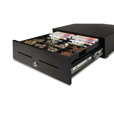 Like all the products in the Safescan HD series, the 4142 cash drawer is made of tough, rugged materials. Its thick-gauge steel casing and shatterproof PVC tray are designed to withstand constant operation: perfect for high-traffic retail venues such as restaurants, bars and gas stations.This heavy-duty cash drawer is ideal for use in high volume retail environments, bars, restaurants and gas stations. Featuring a metal casing, an extra solid telescopic sliding mechanism with ball bearings and a strong pvc drawer tray, the Safescan HD-4142 has been tested to last for at least 2 million open/close cycles.Adjustable banknote dividers let you customize the HD-4141S for exactly the bills you want to store, and 8 coin cups keep all your small change and tokens neatly sorted in one convenient place. A spacious media slot provides plenty of room to store coupons, credit-card slips and other non-cash transaction media.The HD-4142 is equipped with a sturdy 3-position, 4-function lock and an industry-standard RJ-12 outlet to maximize ease of use without compromising security. Set the drawer to open automatically via your cash register or printer, or open it manually; lock it in the closed position (if you have to step away) or open position (when empty, to deter robbers). RJ-12 cable included for easy integration into your existing POS system.Package includes:Safescan HD-4142 Cash drawer, 2 piece key set.