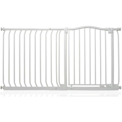 ManoManoGeneral description The Safetots Matt Curved Top Safety Gate is designed with the latest stair gate technology, providing a stylish and robust solution for parents. It is ideal for wider openings, ensuring safety without compromising on aesthetics. Technical specifications Width: 134cm - 143cm (can be extended up to 280cm with additional extensions) Height of the top curve: 75.6cm from the floor Installation Pressure fitted, requiring no screws into walls Easy installation guide included for quick setup Can only be installed in a straight line Usage Opens in either direction for convenience Features auto close technology to ensure the gate is securely closed Stay open technology allows the gate to remain open beyond ninety degrees for easy passage Quick check indicator alerts if the gate is securely locked or improperly installed