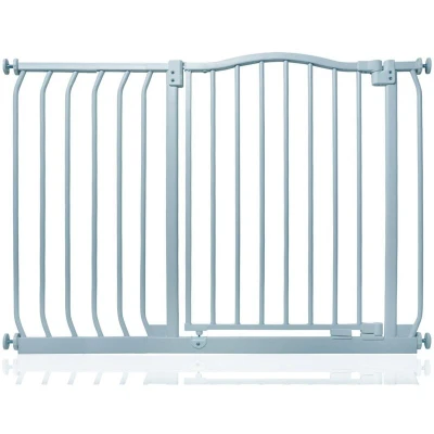ManoManoGeneral description The Safetots Matt Curved Top Safety Gate is designed with the latest stair gate technology, providing a stylish and robust solution for parents. It is ideal for wider openings, ensuring safety without compromising on aesthetics. Technical specifications Height of the top curve: 75.6 cm from the floor Width: Adjustable from 98 cm to 107 cm Maximum width with extensions: 280 cm Installation Pressure fitted, requiring no screws into walls Easy installation guide included Can only be installed in a straight line Usage Opens in either direction Features auto close technology for secure closure Stay open technology allows the gate to remain open beyond ninety degrees Quick check indicator alerts if the gate is securely locked or improperly installed