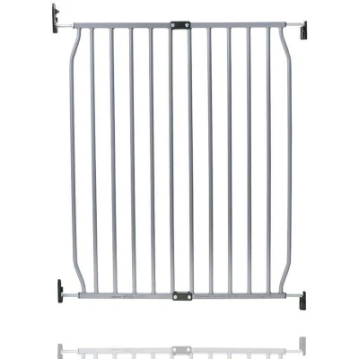 ManoManoGeneral description The Safetots Eco Screw Fit Baby Gate is designed for safety and convenience, featuring a grey finish and adjustable width of 70cm to 80cm. It consists of two panels connected by a central connector, making it suitable for standard openings. For wider spaces, extensions can be added to accommodate widths up to 140cm. Technical specifications Width: 70cm - 80cm (expandable up to 140cm with extensions) Type: Screw fit Color: Grey Installation The installation process is straightforward, consisting of five easy steps. The screw fit design eliminates the traditional overlapping system found in other gates, simplifying setup. Usage This gate features a manual opening and closing system with a push-to-release button that can be easily activated with a thumb. Once passed through, the fittings can be easily slotted back into the cradle. The gate is designed for use at the top of stairs, as it does not have a trip bar, enhancing safety. It includes a one-way restrictor to