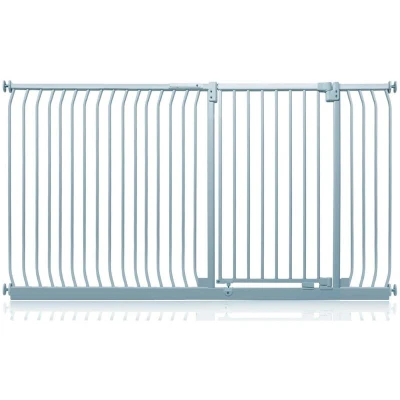 OVER 20 YEARS OF TRUST – Safetots, a family-owned business, has been dedicated to creating safe and secure spaces for children and pets for over two decades. Our commitment to safety and quality ensures that our products are rigorously tested to meet the highest current standards. With a legacy of trust and reliability, Safetots is a name you can depend on for your family's safety needs. RELIABLE SAFETY - Crafted from durable materials, our products ensure long-lasting protection. Smooth, rounded edges prevent injuries, while finishes are lick-safe and bite-proof for ultimate safety. Our sturdy baby gates feature robust, toddler-climb-proof, and finger-safe construction with a double-lock childproof opening system. Designed to exceed industry safety testing, all our baby gates pass the stringent Safety Barrier Standards EN1930:2011, providing unparalleled security. Safetots Extra Tall Elite Safety Gate, 198cm - 207cm COLOUR - Matt Grey - Features a high-quality paint finish that is rigorously tested and certified to be free from harmful chemicals. This ensures a child-safe coating, providing peace of mind while maintaining a durable and attractive appearance. HEIGHT OF GATE - When installed - 96.8cm PRESSURE FIT TECHNOLOGY - Securely mounts the safety gate without the need for drilling, using a pressure-fit system that creates a strong and stable barrier by applying tension between the gate and the walls or door frames. Ideal for easy installation and removal. ALL OPTIONS GATE STOPPER - Customize your gate to open in one direction or both, providing safety and flexibility to suit your specific needs. OPEN GATE WARNING INDICATOR - Our visual indicator reassures you that the gate is correctly closed and secure, offering you peace of mind. AUTOMATIC CLOSING SYSTEM - The gate closes behind you for peace of mind and eliminates the worry of accidentally leaving the gate open. WIDE WALK-THROUGH - The spacious opening allows for easy passage, making it convenient for adults and older children. EASILY EXTENDABLE - The gate can be effortlessly extended with simple one-piece gate extensions, accommodating various doorway widths. STAY OPEN TECHNOLOGY - The gate can be fixed in the open position when pushed past 90 degrees, staying open until you decide to close it, offering convenience for busy households. ERGONOMIC HANDLE - Designed for comfortable and easy use, the handle ensures easy one-hand opening and closing. EXTRA TALL - Designed to be exceptionally tall, sturdy, and secure, making it ideal for both children and pets. Meets EN1930:2011 safety standards. EASE OF INSTALLATION & STYLISH DESIGN - Our gates offer quick, simple installation with detailed instructions for a secure fit. The intuitive one-hand opening mechanism for adults and easy-to-close, secure locking system enhance user-friendliness. Stylish and high-quality designs complement your home interior, making our products highly rated for reliability and ease of use. A comprehensive warranty is included, reflecting our commitment to customer satisfaction and product excellence.