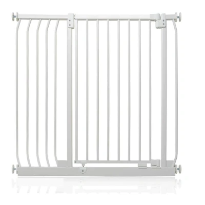 OVER 20 YEARS OF TRUST – Safetots, a family-owned business, has been dedicated to creating safe and secure spaces for children and pets for over two decades. Our commitment to safety and quality ensures that our products are rigorously tested to meet the highest current standards. With a legacy of trust and reliability, Safetots is a name you can depend on for your family's safety needs. RELIABLE SAFETY - Crafted from durable materials, our products ensure long-lasting protection. Smooth, rounded edges prevent injuries, while finishes are lick-safe and bite-proof for ultimate safety. Our sturdy baby gates feature robust, toddler-climb-proof, and finger-safe construction with a double-lock childproof opening system. Designed to exceed industry safety testing, all our baby gates pass the stringent Safety Barrier Standards EN1930:2011, providing unparalleled security. Safetots Extra Tall Elite Safety Gate, 98cm - 107cm COLOUR - Matt White - Features a high-quality paint finish that is rigorously tested and certified to be free from harmful chemicals. This ensures a child-safe coating, providing peace of mind while maintaining a durable and attractive appearance. HEIGHT OF GATE - When installed - 96.8cm PRESSURE FIT TECHNOLOGY - Securely mounts the safety gate without the need for drilling, using a pressure-fit system that creates a strong and stable barrier by applying tension between the gate and the walls or door frames. Ideal for easy installation and removal. ALL OPTIONS GATE STOPPER - Customize your gate to open in one direction or both, providing safety and flexibility to suit your specific needs. OPEN GATE WARNING INDICATOR - Our visual indicator reassures you that the gate is correctly closed and secure, offering you peace of mind. AUTOMATIC CLOSING SYSTEM - The gate closes behind you for peace of mind and eliminates the worry of accidentally leaving the gate open. WIDE WALK-THROUGH - The spacious opening allows for easy passage, making it convenient for adults and older children. EASILY EXTENDABLE - The gate can be effortlessly extended with simple one-piece gate extensions, accommodating various doorway widths. STAY OPEN TECHNOLOGY - The gate can be fixed in the open position when pushed past 90 degrees, staying open until you decide to close it, offering convenience for busy households. ERGONOMIC HANDLE - Designed for comfortable and easy use, the handle ensures easy one-hand opening and closing. EXTRA TALL - Designed to be exceptionally tall, sturdy, and secure, making it ideal for both children and pets. Meets EN1930:2011 safety standards. EASE OF INSTALLATION & STYLISH DESIGN - Our gates offer quick, simple installation with detailed instructions for a secure fit. The intuitive one-hand opening mechanism for adults and easy-to-close, secure locking system enhance user-friendliness. Stylish and high-quality designs complement your home interior, making our products highly rated for reliability and ease of use. A comprehensive warranty is included, reflecting our commitment to customer satisfaction and product excellence.