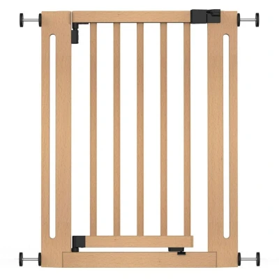 General description The Safetots Wooden Elegance Gate combines stylish elegance with versatility. Crafted from high-quality sustainable PEFC natural wood, this gate enhances your home’s decor while ensuring a safe environment for your little ones. Its warm finish complements any interior, making it a sophisticated addition to any room. Designed for durability, it features robust, toddler-climb-proof, and finger-safe construction. The gate opens in both directions and includes a manual closing system for quick and secure locking. It meets the rigorous EN1930:2011 Safety Standard, ensuring peace of mind for parents. Technical specifications Material: Sustainable PEFC natural wood Height: 63 cm - 71 cm Safety Standard: EN1930:2011 Installation Pressure fit technology for quick and hassle-free installation No drilling required Mounts securely to walls or door frames using tension Usage Ergonomic handle for comfortable one-hand operation Convenient for passing through with a baby or