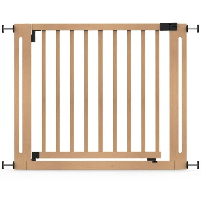 General description The Safetots Wooden Elegance Gate combines stylish elegance with versatility. Crafted from high-quality sustainable PEFC natural wood, this gate enhances your home’s decor while ensuring a safe environment for your little ones. Its warm finish complements any interior, making it a sophisticated addition to any room. Designed for durability, it features robust, toddler-climb-proof, and finger-safe construction. The gate opens in both directions and includes a manual closing system for quick and secure locking. It meets the rigorous EN1930:2011 Safety Standard, ensuring peace of mind for parents. Technical specifications Dimensions: 95cm - 103cm width Height: 73cm Material: Sustainable PEFC natural wood Installation Thanks to its pressure-fit technology, installation is quick and hassle-free with no drilling required. The gate securely mounts to walls or door frames using tension, providing a stable barrier you can trust. Usage The ergonomic handle ensures