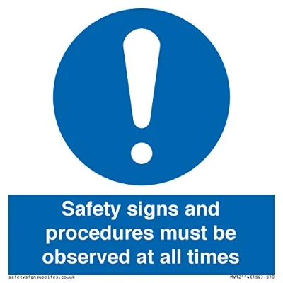 M001 : General mandatory action This sign is made from plastic semi-rigid 1mm 1mm thin plastic sign, can be screwed, stuck with adhesive, or attached with cable ties. Not suitable for hanging. S10 square Sign Text: Safety signs and procedures must be observed at all times
