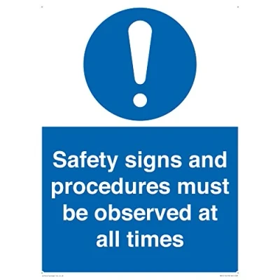 M001 : General mandatory action This sign is made from plastic semi-rigid 1mm 1mm thin plastic sign, can be screwed, stuck with adhesive, or attached with cable ties. Not suitable for hanging. A3 portrait Sign Text: Safety signs and procedures must be observed at all times