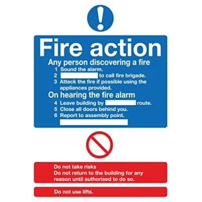 This fire action safety sign details the actions to be taken in the event of a fire in your workplace Pre-printed with instructions, the sign contains blank spaces for personalising to your building This rigid PVC sign is A4 in size