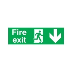 Universal symbol for the emergency fire exit. Widely recognisable and clear. Clearly indicates Fire Exit. Rigid PVC. Colour: Green and White. Size: 150x450mm. Features running man and down arrow.