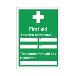 First Aiders information sign. Universal symbol and colour scheme. Space to fill in the name and telephone number of first aiders. Additional space for location of nearest first aid box. Keep employees informed in case of accidents.