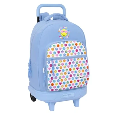 Warranty and quality: Smiley World Joyful, official large backpack with removable wheels with 2 year warranty UNIQUE DESIGN Made from a very durable polyester material and soft zippers. Easy to clean SPACIOUS & LIGHTWEIGHT:Two main compartments with large capacity. Large front pocket with internal organizer. Side pockets for water bottles. Double zipper on main zippers for easy opening Ergonomics and comfort: padded shoulder pads. Lined top handles Sturdy and durable: this product is specially designed for its durability and is made of high strength materials to ensure that it can be used in all types of activities to ensure its functionality