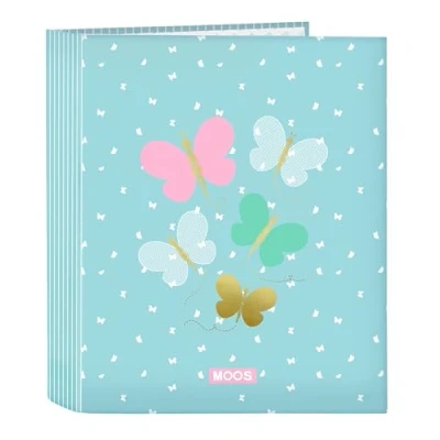 Warranty and quality: Moos Butterflies, official folder with high-quality rings. Hard and durable cover. 2 years warranty UNIQUE DESIGN: Folder made from a very resistant cardboard material FORMAT: 60 mm wide spine. Hard covers lined. Foolscap 4 x 25mm Round Jump Rings Measurements: Width 265 mm Length 330 mm. Weight 0.4 kg ALL AUDIENCES: Ideal for children who attend school both kindergarten, primary and secondary school RESISTANCE AND DURABILITY: This product is specially designed with durability in mind, made with high strength materials to ensure that it can be used in all kinds of activities, ensuring its functionality