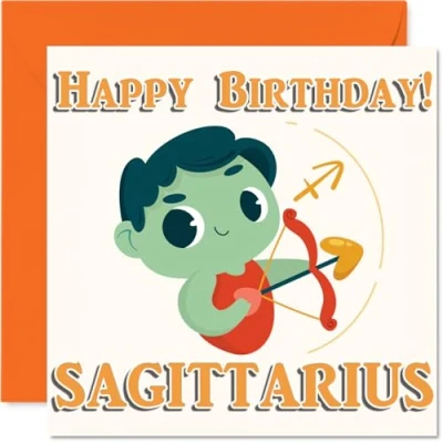 MAKE HIM SMILE WITH THIS UNIQUE BIRTHDAY CARD: This exceptional quality Male birthday card for him shows the design 'Sagittarius'. If you are looking for a unique birthday card Boys for him, then then this happy birthday card is bound to make him smile. Not just a birthday card for Men this could also be a birthday gifts for Cousin, Nephew, Husband, Neighbour, Colleague, Dad, Son or Friend. WHAT DO YOU GET: The card is printed on one side and BLANK ON THE INSIDE to allow you to write your very own message. The unique fun design is printed on a specially sourced and environmentally responsible board. At 360 microns thick the natural white one-sided gloss board has a quality look and feel. Supplied with a coloured gummed envelope to complement the design and ready to be sealed and sent in the post. Great Cousin birthday cards, Boys birthday card, Nephew birthday card. NO INK SMUDGES: There is nothing worse than writing inside a card to find that the shiny surface makes the ink smudge. This is why we use a high quality one sided coated board. The uncoated side will absorb more of the ink from your pen to make smudging a thing of the past. Birthday cards for Husband, Birthday card for Neighbour, Birthday cards for Colleague. SIZES: Greeting Card = 145mm x 145mm, Envelope = 155mm x 155mm, Card Thickness = 360 micron. Dad birthday card, birthday cards for Son, unique birthday cards for Friend, Boys birthday card Cousin, Nephew birthday card. MADE AND QUALITY CHECKED IN THE UK: We print and manufacture all our products right here in the UK so you can be sure of a fast turnaround and a product that is expertly made. Using environmentally responsible premium board our card is conscious of the responsible management of the world's forests - perfect birthday cards for Men, fun birthday cards for her, Nephew birthday cards, male birthday cards.