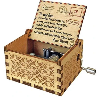【High Quality Material,Equipped Good Music Movement】The music box is made of good boxwood,Environmental protection material,No bad smell.It equips more stable and durable music movement. 【No Batteries required,Easy to Use】Open the lid,Turn the handle and it will play a well-known melody “You are my Sunshine” , You can control the rhythm speed by yourslef. Any people can play it,including Kids. 【Exquisite design,Easy to carry】The music box size is 2.6"×2"×1.5"(6.5cm×5cm×3.8cm) you can put it in your Palm or Pocket,Lightweigth and portable,Easy to Carry. 【Very Memorable Gift to Your Son】It is with Exquisite Workmanship.There are very beautiful patterns on the surface of music box.They are carved by laser.It will be the nice gift to your Son on Birthday,Valentine’s,Day,Christmas day or Anniversary. 【Good and Timely After-sale Service】We provide 12 months’ Warranty for all our products.When you meet any problems,please contact us.We will reply you within 12 hours and provide you satisfied solution.