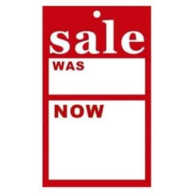 SALE was Now and I Love Sale Was Now Cards Tagging Gun Hanger Swing Tickets – SMALL, MEDIUM AND LARGE Unstrung ticket with punch hole in top centre. Ideal for use with tagging guns and coat hangers. The bright red colour of these quality tickets attracts more attention to your sales items. It can be attached to your products as eye catching Reduced WAS/NOW cards.