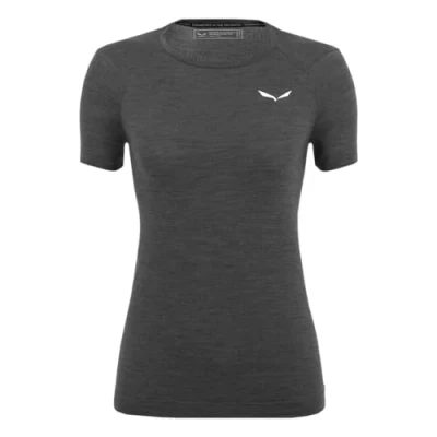 A women’s lightweight, thermoregulating technical merino-Tencel short-sleeved baselayer for summer alpine routes. Lightweight Quick Drying Breathable Salewa Committed