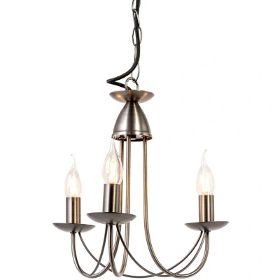 General description The Sally 3 Light Traditional Style Chandelier in Pewter is designed to add a classic and traditional style with a modern touch, featuring 3 decoratively curved arms and candle bulb holders. This stunning ceiling light fitting is perfect for most rooms and has a height adjustable drop to fit your space. Technical specifications Product Type: Chandelier Bulbs Required: 3 (Not Included) Bulb Type: E14 Small Edison Screw Max Bulb Wattage: 6 Watt Max Bulb Voltage: 240 Volt Light Source: LED Height: 132 cm approx. Diameter: 33 cm approx. Ceiling Cap Diameter: 12 cm approx. Drop: Max: 132 cm, Min: 45 cm approx. Material: Metal Colour: Pewter Weight: 1.04 kg