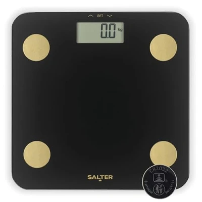 SALTER SMART SCALE: Perfect for kickstarting a healthier lifestyle, this Salter smart scale offers an impressive 180kg capacity for a range of users and has simple step-on technology for quick and reliable readings. GOLD & BLACK DESIGN: Featuring a stunning black glass platform paired with luxurious gold analyser sensors, this scale is a stylish statement piece for your bathroom and fits perfectly into any home. ANALYSER FEATURES: More than just weight! This scale is designed with 7 analyser functions including body weight, fat, water percentage, BMI, BMR, bone density, and muscle mass so you can receive a full picture of your health. ATHLETE MODE: Athlete Mode adjusts the calculations to provide more accurate measurements based on higher muscle mass and activity levels. Train smarter with data you can trust. EASY TO USE: Storing profiles for up to 9 different users, this scale is ideal for families or fitness groups. The digital LCD display provides clear readings each individual so everyone can stay on track of their unique fitness goals.
