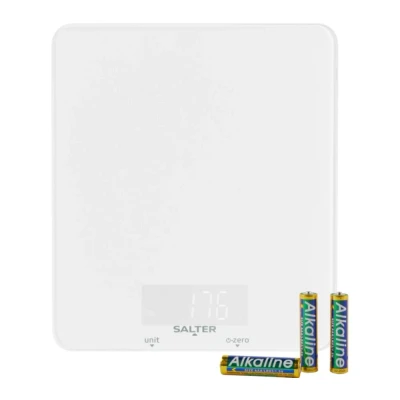 Salter Boston Kitchen Scale 5kg Capacity, Add & Weigh Tare Function, Aquatronic, Easy Read Backlit Display, Batch Meal Prep Cooking/Baking, 1g Increments, Slim Design, ml/fl.oz/lb, Ice White Shimmer