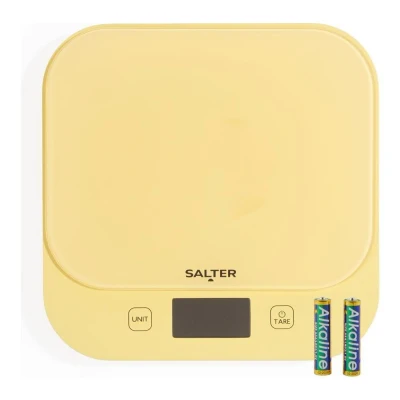 Salter British Bakes Digital Kitchen Scale Yellow Baking Scale, High 10kg Capacity, Measures Liquids, Waterproof, Add & Weigh Tare Function, Tempered Glass Platform, 1g Precision, Backlit Display