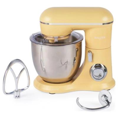 Salter British Bakes Stand Mixer 5L Food for Baking, 1300W, 10 Speeds, Easy Control Dial, Removeable Splash Guard, Yellow Electric Kitchen Appliance with Whisk, Dough Hook and Beater