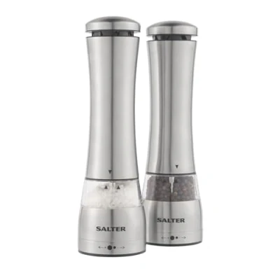 Salter BW11847EU7 Electric Pepper Mill Set One Hand Push Button Operation, Ceramic Mechanism, Clear Acrylic, Adjustable Grind, LED Light Base, Peppercorns & Rock Salt, Stainless Steel