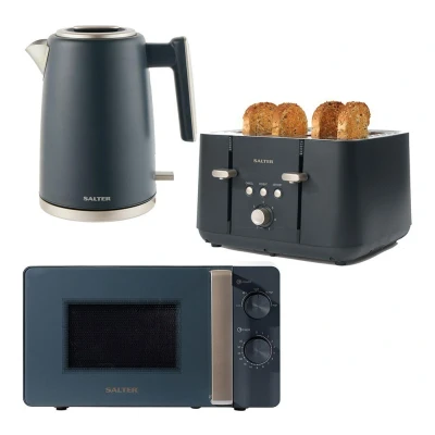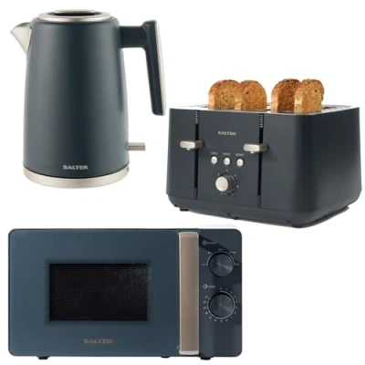 AmazonRefresh your kitchen with this matching set of Salter Marino countertop electricals, including a kettle, toaster, and microwave. Featuring rapid boil and a limescale filter, as well as a boil-dry sensor and auto shut-off, this kettle offers functionality and safety. With 4 wide slots, self-centring bread guides and an anti-jamming function, the toaster ensures perfect toast or crumpets every time. With a 27cm rotating glass turntable, a 35-minute timer, 5 power levels and a defrost setting, the microwave is the ideal worktop appliance. Get the set: Keep your kitchen countertop fully coordinated with Salter Marino. Compliment with the canisters and breadbin., Weight: 32.55492735533334 pounds, Manufacturer: Salter