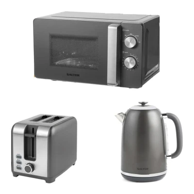 Level up your kitchen with this stylish Salter Cosmos kitchen bundle. Prepare a morning cuppa with the 1.7 litre jug kettle and don't worry if you forgot about it, the boil-dry protection will keep you safe. Prepare the perfect toast while you wait with the 2-slice toaster. Offering 7 browning levels, you can have anything from barely-bronzed to darkly toasted. And don't worry about lunch either. Heat up yesterday's leftovers in the 800 W microwave or get the chicken for tonight's dinner defrosted. Good to know - The microwave has a 27 cm glass turntable so you can easily fit in a dinner plate - Put on the 35-minute timer and relax as your dinner warms up in the microwave - Cook, warm, and thaw with absolute precision using the micorwave's 5 power levels - Defrost, reheat and cancel your toast slices with the push of a button - The kettle's limescale filter guarantees a pure, untainted brew every time