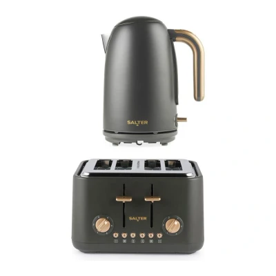Currys- You can brew up for the whole family or office with the 1.7 litre capacity of this Salter kettle - With 3000 W of power, it has a rapid boil, so you'll make a tasty drink in seconds - The kettle has a 360° swivel base for easy use, whether you're left or right handed - The boil dry sensor turns the kettle off if there's no water inside, giving you peace of mind - The Salter toaster has wide slots, so you can toast 4 thicker slices of bread or waffles at once - With 6 browning levels it's easy to adjust to your preferences - The removable crumb tray makes for easy cleaning