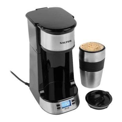 Salter Digital Coffee Maker One Cup Filter Machine, Washable & Reusable Filter, Includes 420ml Stainless Steel Travel Mug, 3 4 Minutes Brewing, Suitable For Ground / Pads, Timer, 750W