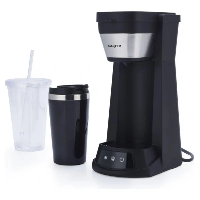 Indulge in barista-style drinks at home with this Salter iced coffee maker. Its 2-in-1 design lets you create delicious hot or cold coffee over ice with ground coffee or pads. Just pop in some water and coffee, add ice to your cup, and let the machine do the rest. It comes with a 420 ml double-walled travel mug and a 440 ml plastic iced coffee cup. Now you can take your favourite drinks with you wherever you go. And you can mix and match different milks and syrups to create customised drinks. Share your creations with your family and friends.Good to know- The touch controls and LED display make it easy to create your drink- With 3 coffee strength settings, you can make your drink just the way you like it- The auto shut-off gives you peace of mind if you have to leave the house in a rush- Its integrated water filter keeps any nasty bits of limescale out of your drink