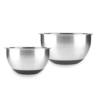 MIXING BOWL SET: Whether you’re whipping up fluffy cake batter or kneading fresh dough, these perfectly sized 20 cm and 24 cm bowls have got you covered for every baking task. BUILT TO LAST: Made from tough stainless steel, these bowls boast a brushed finish exterior and a mirror polished interior. PREP WITH PRECISION: Say goodbye to guesswork! The handy measurement scale inside the bowl helps you get your recipes just right every time. MIX WITH CONFIDENCE: Thanks to the silicone non-slip base, these bowls stay firmly in place, so you can whisk, toss, and stir without a single slip. EXPERT RANGE: Where precision meets performance! The Salter Expert range delivers reliable tools for accurate, fuss-free cooking every time.