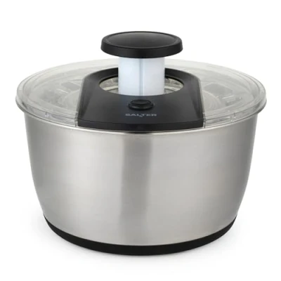 WASH, DRY, SERVE: Have perfectly prepped salad in seconds with this Salter Expert Salad Spinner. Wash, dry and serve your salad in one convenient bowl, leaving crisp greens ready to eat! GENEROUS 6 LITRE CAPACITY: The large 6-litre bowl is ideal for family-sized salads and doubles as a stylish serving bowl—simply add your favourite toppings and dressings right after spinning. EASY TO USE: Simply use one hand on the pump to spin your salad for maximum drying with minimum effort! Powerful yet smooth spinning action dries your salad in seconds, so your ingredients are crisp and ready to serve. NON-SLIP BASE: Featuring a non-slip silicone base for stability during use, this spinner is lightweight and the pump even locks into place for compact storage after use. BUILT-IN DRAINER: Designed with an integrated drainer, this salad spinner allows you to rinse leafy greens and vegetables directly in the bowl. You can then drain off the excess water, minimising spills and keeping your countertop dry.
