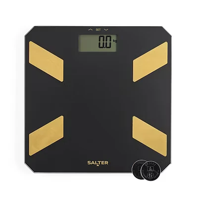 - This Salter bathroom scale gives you a full rundown - body fat, water levels, muscle and bone mass, BMI and BMR - Built with tough glass, it's strong enough to handle daily weigh-ins and even sock-slips - You'll get the numbers in a way that makes sense to you - it reads in kilos, stones, and pounds - The clear LCD display is easy to read so you don't have to bend down to see it - It supports up to 180 kg and has got plenty of room for post-holiday indulgence