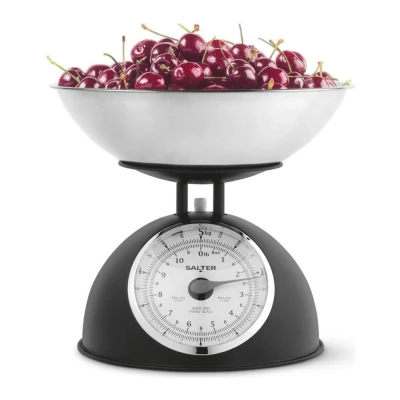 Currys- This Salter kitchen scale's got a classic retro dial that's big and easy to read- No batteries needed - it's fully mechanical, so it's always ready when you are - It displays both metric and imperial units, so you can follow any recipe with confidence- The removable bowl is dishwasher-safe, making cleanup simple after baking or cooking- It can weigh up to 5 kgs, so it's great for bigger batches