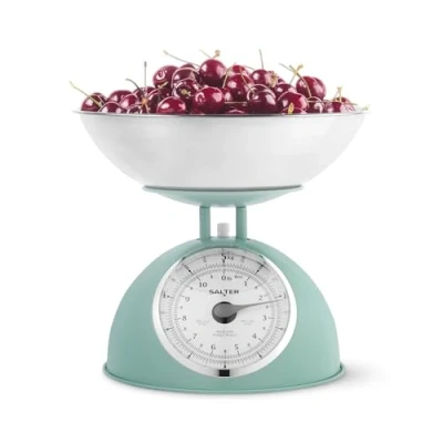 Currys- This Salter kitchen scale's got a classic retro dial that's big and easy to read- No batteries needed - it's fully mechanical, so it's always ready when you are- It displays both metric and imperial units, so you can follow any recipe with confidence- The removable bowl is dishwasher-safe, making cleanup simple after baking or cooking- It can weigh up to 5 kgs, so it's great for bigger batches