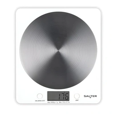 Salter White Disc Digital Kitchen Scale Electronic Food Scale, Add & Weigh Multiple Ingredients, 5kg Capacity, Aquatronic For Measuring Liquids, Easy Read LCD Display, Includes Battery