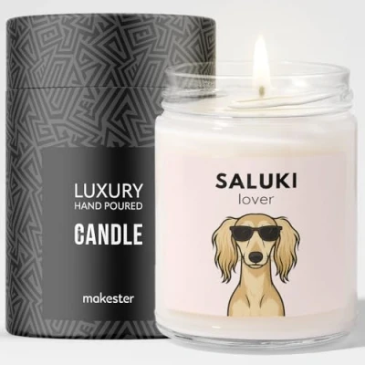 Saluki Gifts Luxury Soy Wax Candle Vanilla, Jasmine, Sugared Almond Dogs in Shades Makester