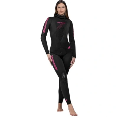 Women's wetsuit for spearfishing two piece jacket and trousers. Super elastic outer lining, open cell interior Sternal support for loading arbalete and pneumatic Neoprene finish reinforcement on face, wrists, ankles and waist Hooded jacket with beaver tail closure