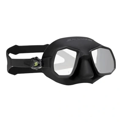 Mask for underwater fishing and apnea at extremely low volume. Construction technology with frame inserted for casting 3D preformed nose and lens shape designed to obtain a great face field Anti-glare matte inner and outer silicone to prevent light reflection The density of silicone has been chosen to achieve a particularly comfortable dressing