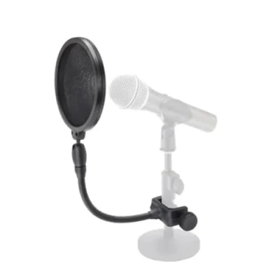 5.25” microphone pop filter Dual-layer 4.75” nylon mesh screen reduces vocal popping (“p-pops”) Extra durable 7.25” gooseneck for optimal filter positioning Ball joint mount for 360 Degree filter rotation C-clamp mount (1” maximum grip) fits most standard mic stand shafts and booms