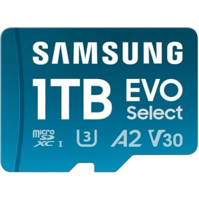 Speed-optimised microSD memory card - perfect for use in smartphones, tablets or laptops High speed: suitable for 4K UHD and Super Slow Motion recordings¹ thanks to up to 160 MB/s² ³ transfer speed (UHS-I U1)⁴ Plenty of space: 1 TB storage capacity for up to 47.1 hours of recording time for 4K UHD videos or 427,708 photos⁵ High security for your data thanks to 6-fold protection: waterproof⁶, temperature-resistant⁷, X-ray-proof⁸, magnet-resistant⁹, drop-proof¹⁰ and wear-free¹¹ ¹² Scope of delivery: 1 x Samsung EVO Select 2024 micro SD card MB-ME1T0SA/EU, 1 TB, Incl. SD adapters for a number of different devices