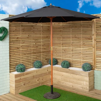 Enjoy stylish and reliable shade in your outdoor space with the Samuel Alexander 2.7m Outdoor Wooden Garden Parasol Sun Shade with Carry Bag in Black, designed to combine classic looks with everyday practicality. Perfect for patios, gardens, terraces and outdoor dining areas, this large garden parasol offers generous coverage and a timeless natural finish.. The 2.7m garden parasol features a high quality black polyester canopy made from durable 180g fabric, providing effective UV protection to help shield you from the sun during warm summer days. The wide 2.7 metre canopy creates ample shade, making it ideal for garden tables, seating areas or relaxing outdoors.. Built with strength and style in mind, this outdoor wooden parasol has a sturdy wooden centre pole with a 38mm diameter, complemented by strong wooden ribs for added support and stability. The natural wood frame gives this wooden garden umbrella a classic and elegant appearance that suits a wide range of outdoor settings.. Standing at a total height of 2.4m, this garden sun shade is quick and easy to assemble. Simply connect the two pole sections together, open the umbrella canopy and secure it by locking the key into the pre-drilled hole. For safe and secure use, it is recommended to use a sturdy parasol base (sold separately). When not in use, the parasol can be easily stored away using the included storage carry bag, helping to protect it from the elements and extend its lifespan. The carry bag with strap makes transportation and storage simple and convenient.. Product Specifications. Total Height: 2.4m. Canopy Diameter: 2.7m. Pole Diameter: 38mm