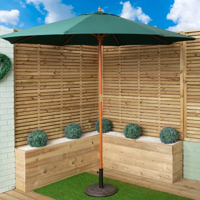 Enjoy stylish and reliable shade in your outdoor space with the Samuel Alexander 2.7m Outdoor Wooden Garden Parasol Sun Shade with Carry Bag in Green, designed to combine classic looks with everyday practicality. Perfect for patios, gardens, terraces and outdoor dining areas, this large garden parasol offers generous coverage and a timeless natural finish.. The 2.7m garden parasol features a high quality green polyester canopy made from durable 180g fabric, providing effective UV protection to help shield you from the sun during warm summer days. The wide 2.7 metre canopy creates ample shade, making it ideal for garden tables, seating areas or relaxing outdoors.. Built with strength and style in mind, this outdoor wooden parasol has a sturdy wooden centre pole with a 38mm diameter, complemented by strong wooden ribs for added support and stability. The natural wood frame gives this wooden garden umbrella a classic and elegant appearance that suits a wide range of outdoor settings.. Standing at a total height of 2.4m, this garden sun shade is quick and easy to assemble. Simply connect the two pole sections together, open the umbrella canopy and secure it by locking the key into the pre-drilled hole. For safe and secure use, it is recommended to use a sturdy parasol base (sold separately). When not in use, the parasol can be easily stored away using the included storage carry bag, helping to protect it from the elements and extend its lifespan. The carry bag with strap makes transportation and storage simple and convenient.. Product Specifications. Total Height: 2.4m. Canopy Diameter: 2.7m. Pole Diameter: 38mm