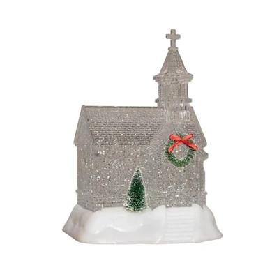 AmazonEnhance your indoor Christmas decor this year with this light up Christmas Church. Illuminated by white LEDs and a glittering snow storm effect, this decoration is sure to bring the magical feeling of Christmas. Clear acrylic of a Church with a Christmas wreath and a Christmas tree. Battery powered, requires 3 x AA. Batteries not included. For indoor use only, suitable for most flat surfaces.