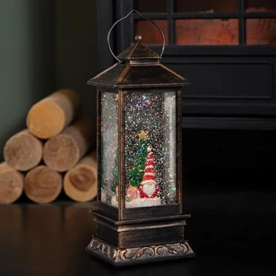 Bring a touch of nostalgic festive charm to your home with this 28cm Light Up Antique Lantern Christmas Water Spinner with Snowy Gonk Scene. Designed with a beautiful antique effect lantern finish, this decorative piece captures the warmth and magic of a traditional Christmas.. Inside the lantern, a delightful festive scene comes to life, featuring an adorable Gonk dressed like Santa, surrounded by gently swirling snow glitter and a classic Christmas tree. The lantern illuminates with warm white LEDs, casting a soft, cosy glow that enhances the festive scene and makes it perfect for displaying on most suitable flat surfaces.. For ease and convenience, the water spinner is battery operated and requires 3 x @@@G9FgIfs6ATiyq4K6JDdsqZSTreItRC4N@@@ batteries (not included), allowing you to place it anywhere without the need for cables. It also includes a built in timer function, operating on 6 hours on and 18 hours off.. Suitable for indoor use only.. Product Specifications. Warm White LEDs. Height: 28cm Width: 12cm. Requires 3 x AA Batteries. Timer Function 6 hours on 18 hours off