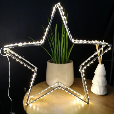 ManoManoGeneral description This LED Dewdrop Christmas star decoration is designed to brighten up your home during the festive season. With its stunning appearance, it is suitable for both indoor and outdoor use, making it versatile for various placements such as on a side table, in the window, or by the front door to welcome guests. Technical specifications Dimensions: 38 cm Bulb spacing: 1.6 cm Number of LEDs: 180 LED color: Warm white Power source: Mains operated Clear cable length: 8 meters Other information Static LED function Frame material: Metal (Grey)