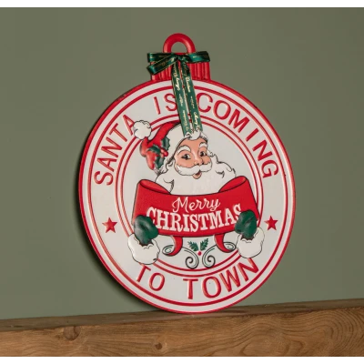 Add a nostalgic touch to your holiday decor with this 47cm Round Metal Santa Sign, featuring the cheerful message "Santa is Coming to Town". This beautifully designed sign showcases a classic Santa Claus illustration in vibrant red and white, capturing the magic and excitement of the Christmas season. Made from durable metal, this festive decoration is perfect for both indoor and outdoor use, making it a versatile addition to your holiday decor.. Hang it on your wall, door, or even display it as part of your holiday setup to create a warm, welcoming atmosphere for friends, family, and guests. Whether you're looking to enhance your home's seasonal charm or searching for the perfect holiday gift, this Santa sign is sure to bring smiles and holiday cheer for years to come.. Product Features:. • Classic Christmas Design – Features a vintage-style Santa with the words "Santa is Coming to Town" in festive red and white.. • Durable Metal Construction – Made from high-quality metal, ensuring it lasts for many holiday seasons.. • Versatile Display Options – Perfect for hanging on walls, doors, or adding to your Christmas decor displays.. • Large Size – Measuring 47cm in diameter, this eye-catching sign will stand out in any festive setup.. • Perfect Holiday Gift – A thoughtful and festive gift for anyone who loves Christmas decorating.. Bring the joy of Santa and the festive season into your home with this charming and timeless decoration!